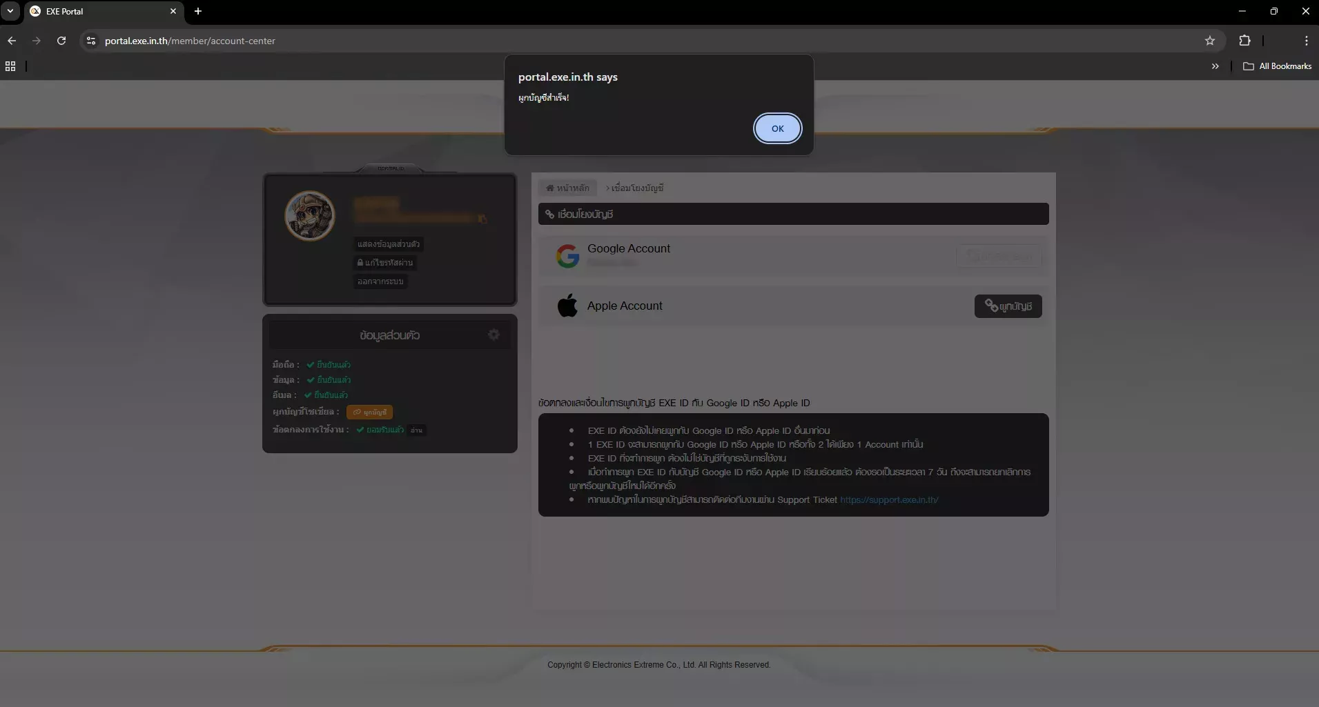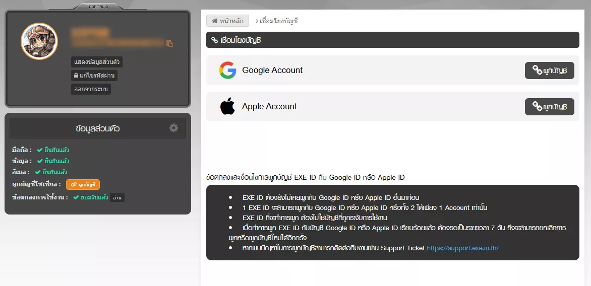 • หากพบปัญหาในการผูกบัญชีสามารถติดต่อทีมงานผ่าน Support Ticket https://support.exe.in.th/