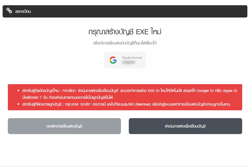 หากท่านต้องการผูก EXE ID เดิมที่มีอยู่แล้ว กรุณากด “ยกเลิก” ในส่วนนี้เพื่อกลับไป Login ด้วย ID เดิมก่อน แล้วค่อยทำการผูกบัญชี Google ID และ Apple ID ที่ต้องการในหน้าระบบสมาชิก หากทำผ่านขั้นตอนนี้ไปแล้วจะต้องรอ 7 วันเพื่อปลด “ID” ที่เชื่อมอยู่