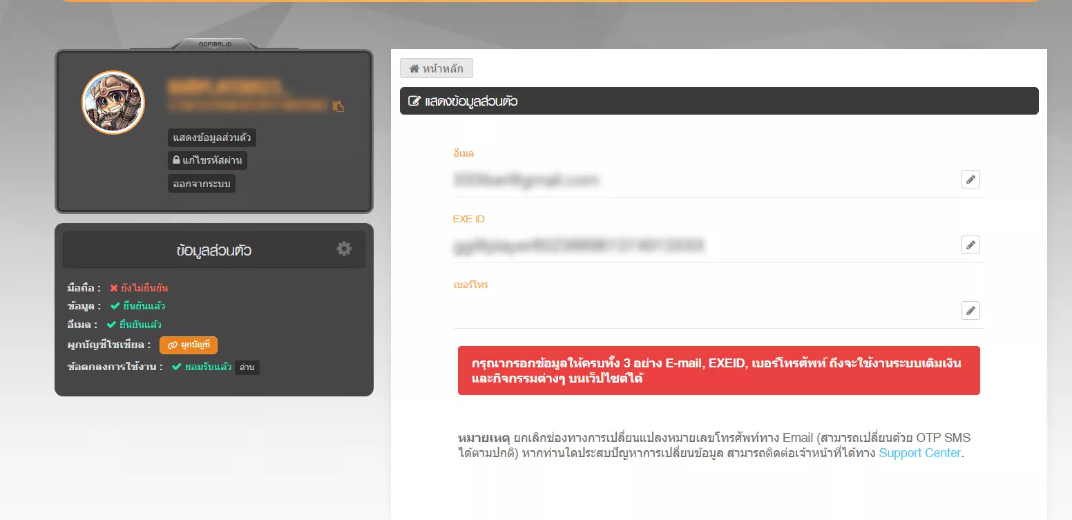 • E-Mail ที่ถูกใช้ในการใช้ผูกบัญชีไปแล้ว จะไม่สามารถผูกซ้ำกับ EXE ID อื่นได้